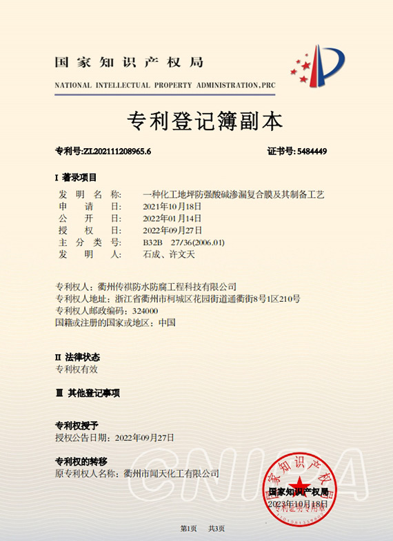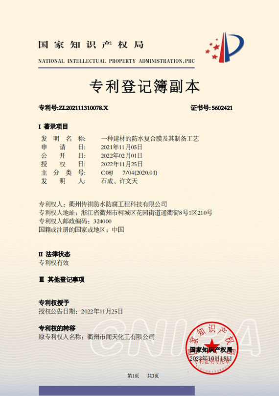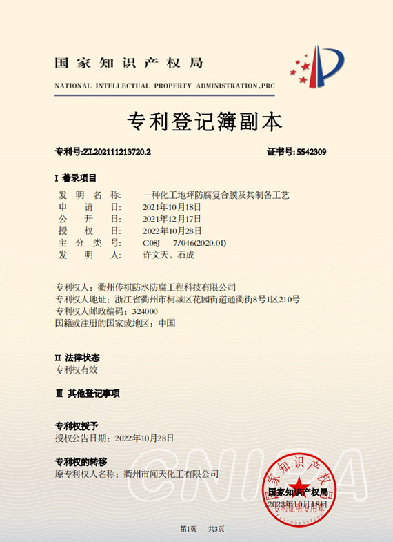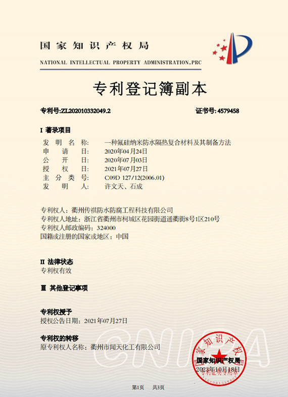 衢州傳祺新材料科技有限公司是衢州市聞天化工有限公司的下屬企業;衢州市聞天化工有限公司成立于2003年,是國內最早研發(fā)、生產氟碳涂料的企業之一。衢州傳祺新材料科技有限公司成立于2017年,公司專注于高分子氟材料的開發(fā)和含氟材料在防腐、防水領域的應用。經過6年的不懈努力,已獲得了化工和建筑領域六項國家發(fā)明專利授權和兩項新產品科技成果獎,參與了中國建筑材料流通協會《房屋修繕防水工程規(guī)范》標準的編制工作,中建協涂裝委員會浙西工作站設立在我公司。